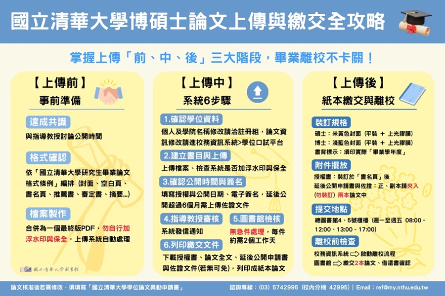 - 凡本校研究生已上傳並經圖書館審核通過之論文全文電子檔,或已繳交至圖書館之紙本論文,倘有內容異動、改延後公開、變更授權等,應填寫「國立清華大學學位論文異動申請書」。已完成離校手續取得學位者,紙本論文不得辦理抽換,須填妥前述異動申請書與「勘誤表」 1 份向圖書館採編組申請勘誤;南大校區同學請至南大分館申請。